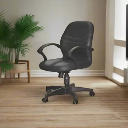 كرسي مكتب دوار بتصميم مدمج وعملي، يغلب عليه اللون الأسود مع قاعدة معدنية لامعة. يبدو الكرسي مصممًا لتوفير الراحة الأساسية والمرونة في الحركة، مما يجعله مناسبًا للمكاتب المنزلية أو المساحات المكتبية التي تتطلب حلاً عمليًا وبسيطًا للجلوس.