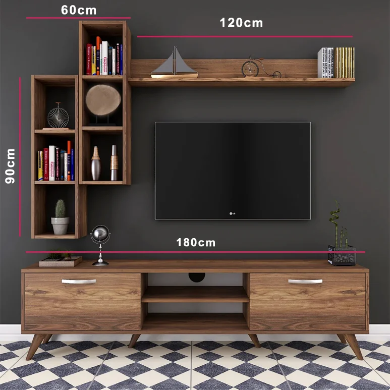 - تصميم متكامل وعصري: تجمع بين وحدة تلفزيون أنيقة ووحدة أرفف عملية لتوفير مساحة منظمة وجذابة.